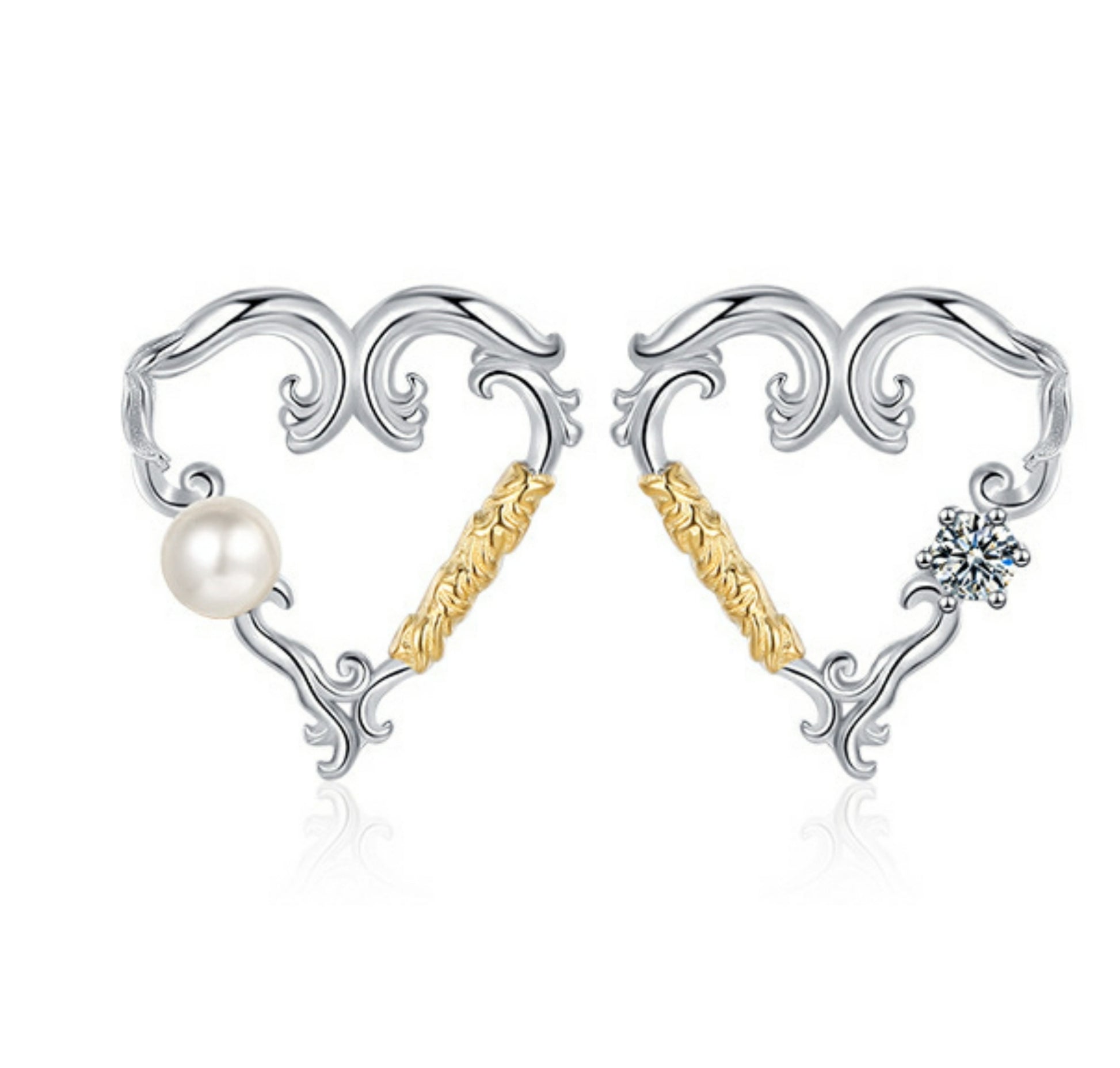 Add a touch of timeless elegance to your look with these exquisite 925 sterling silver heart-shaped earrings. Featuring intricate detailing, one earring is adorned with a sparkling zirconia, while the other showcases a lustrous freshwater pearl. Accented with gold-tone embellishments, these earrings blend sophistication and romance, making them perfect for special occasions or everyday luxury.