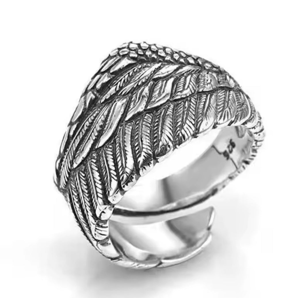 Wrap your finger in the strength and elegance of nature with the Guardian Feather Ring. Handcrafted from solid 925 sterling silver, this bold yet graceful ring features detailed layered feather engravings symbolizing freedom, protection, and spiritual connection. Its open, adjustable design ensures a comfortable fit for all. A unisex piece that blends tribal inspiration with timeless style — ideal for everyday wear or as a meaningful gift.