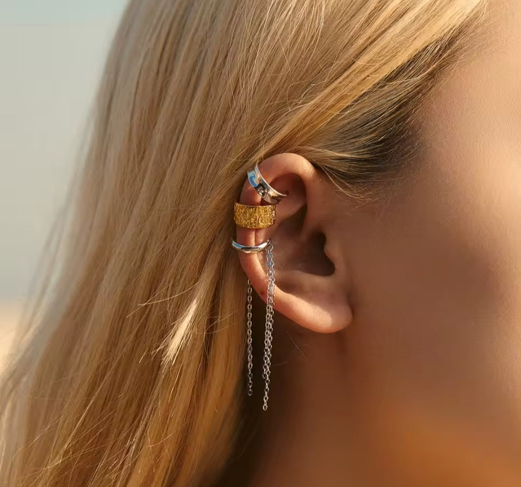 Elevate your style with this elegant ear cuff featuring a delicate chain dangle, crafted from high-quality 925 sterling silver and luxuriously gold-plated. Its sleek cuff design securely clips onto your ear, while the fine chain adds graceful movement and a modern edge. Perfect for layering or wearing solo, this piece effortlessly blends sophistication with a touch of boldness—no piercing required.