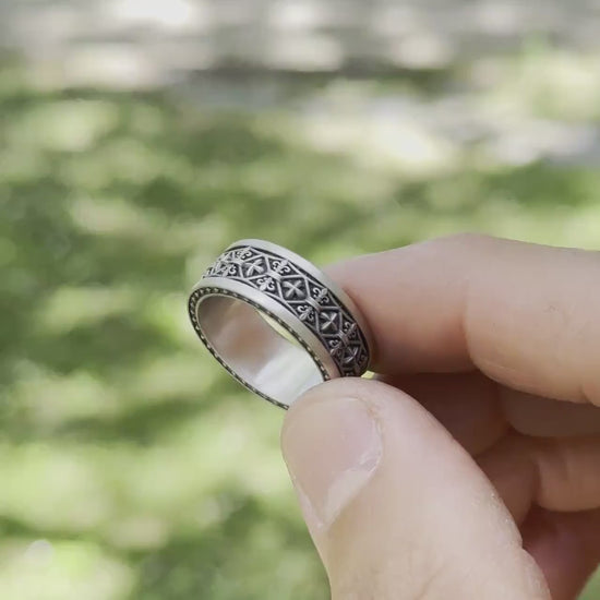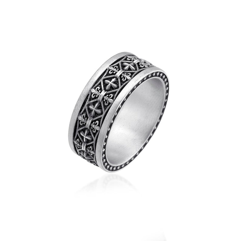 Bold, timeless, and detailed – this renaissance Fleur-de-Lis Band Ring is crafted from solid 925 sterling silver and features an intricate pattern of fleur-de-lis symbols and cross motifs wrapped around a wide band. With its medieval aesthetic and rugged elegance, it’s the perfect statement piece for those who walk their own path. Ideal for everyday wear or as a powerful addition to your renaissance-inspired or alternative collection