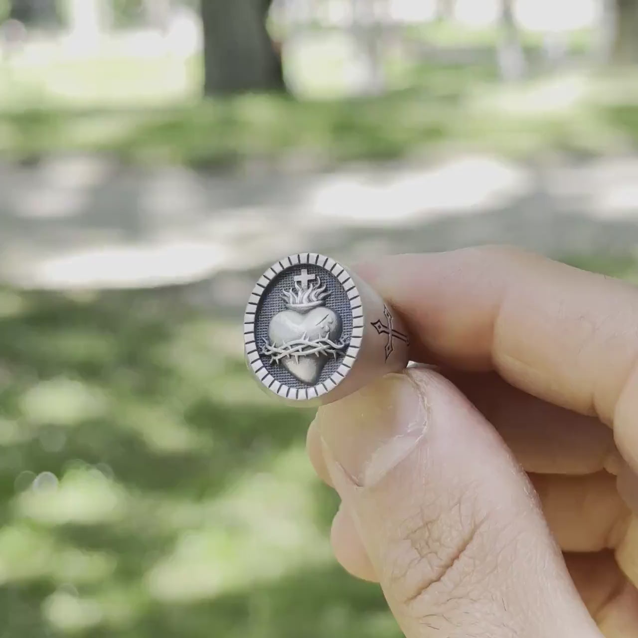 Rooted in divine strength and devotion, Thorn & Flame channels the timeless symbol of the Sacred Heart—burning with eternal love, encircled by the crown of thorns, and marked with sacrifice. Paired with a gothic cross detail on the band, this signet evokes themes of faith, resilience, and redemption. A statement for those who wear their convictions boldly, it’s both armor and emblem. Crafted i solid 925 sterling silver.